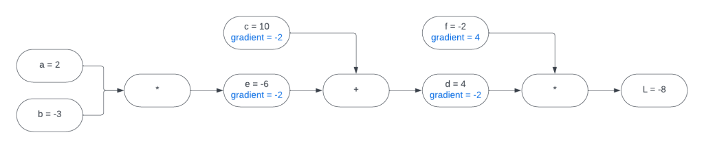 We just found all of the gradients in this expression graph using backpropagation. In case it was not obvious, I called this function because this is exactly what we will do for our loss function. It will be a more complicated function, but the calculations are very similar and they are all derived from the chain rule.