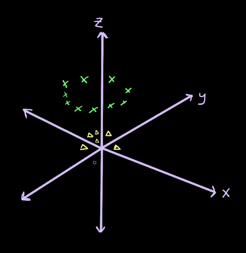 As you can see, because the values of the yellow triangles were smaller before (closer to the origin) they are going to be lower on the axis. The green xs had larger values so they are going to be higher on the