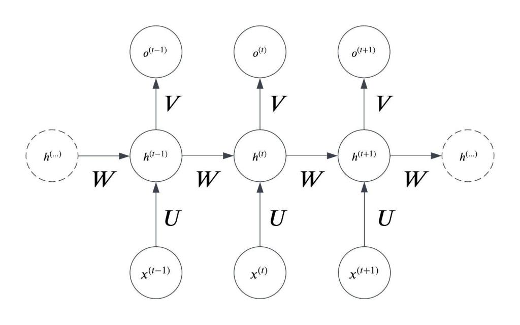 As we talked about in the first post, this is essentially a dynamically constructed sequence of feedforward neural nets where the hidden state from the previous timestep is fed back into the hidden layer of the current timestep.